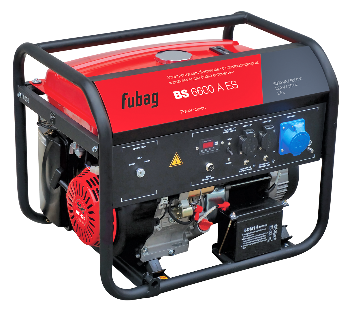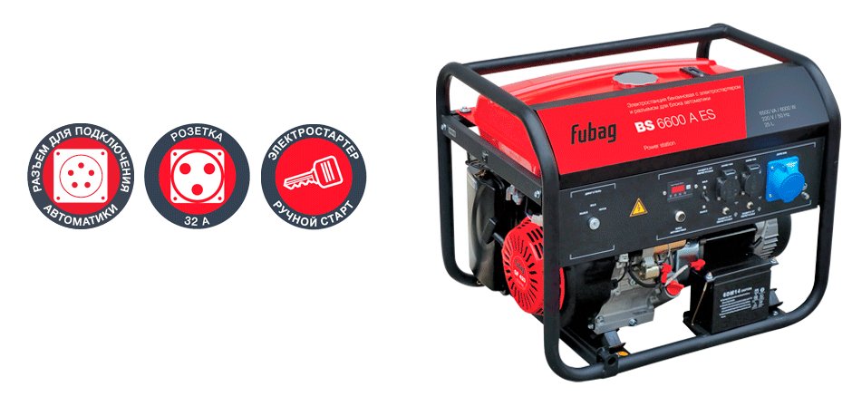 Подходит для аварийного или мобильного электроснабжения и для работы в мастерской или на стройке. С блоком автоматики - отличный выбор в ситуации, когда нужен источник аварийного энергоснабжения загородного дома, способный функционировать в автоматическом режиме, без вмешательства со стороны владельца. Оборудована мощным и экономичным профессиональным OHV-двигателем FUBAG. Номинальная электрическая мощность составляет 5,7 кВт, этого достаточно для работы бытовых электроприборов, включая насосы водоснабжения, электроинструмент и садовую технику. Три розетки на 220 В: две стандартные, рассчитанные на максимальный ток 16 А, и одна усиленная, 32 А, предназначенная для подключения особенно мощных потребителей.