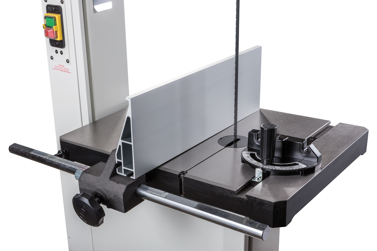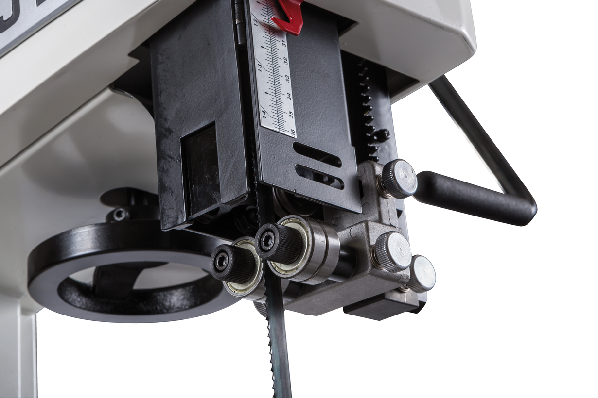 Jet JWBS-15 - ленточная пила нового поколения, предназначенная для профессионального использования. Ее основное преимущество, на фоне аналогов прошлых поколений, - увеличенная высота распиловки. Этот параметр очень важен для тех, кому нужен универсальный станок, способный взять на себя функции делительного. К подобным работам приспособлен и параллельный упор: направляющий профиль можно установить вертикально на боковую грань так, чтобы надежно фиксировать плоские заготовки при их роспуске на тонкие пластины. В целом конструкция бокового упора очень хорошо проработана и соответствует самым строгим требованиям: профиль жесткий и прочный, закреплен на массивном чугунном кронштейне, который перемещается по цилиндрической направляющей. Предусмотрена грубая (вручную) и точная (микрометрическим винтом) установка.