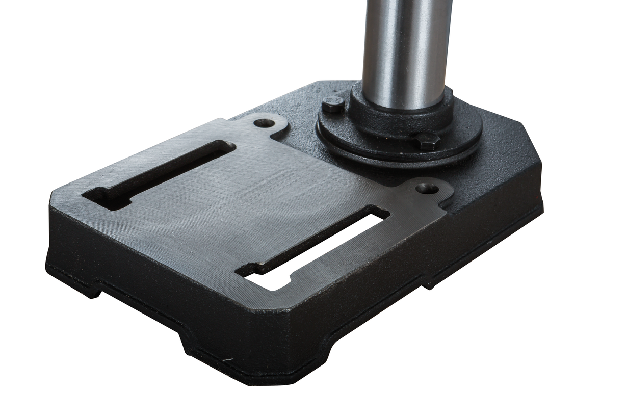 Пиноль шпинделя оборудована резьбовым упором-ограничителем, это простой в настройке и точный механизм, позволяющий производить установки с помощью штангенциркуля, или просто отсчитывая обороты гайки. Заготовку размещают на регулируемом чугунном столе. Он поворачивается вокруг горизонтальной оси, перемещается вверх и вниз по колонне, а если потребуется разместить крупную заготовку, может быть отведен в сторону разворотом на колонне. В таком случае опорой выступает верхняя поверхность подставки станка, отфрезерованная в плоскость, перпендикулярную оси сверления.