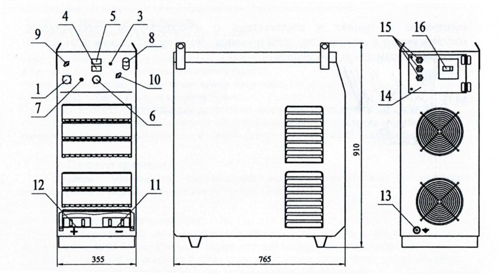 - Потенциометр регулирования выходного напряжения (тока);